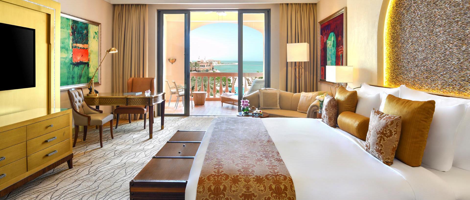 Из номеров Делюкс с видом на море открывается вид на лазурные воды Персидского залива. В номере есть просторная открытая площадка (балкон / терраса). Безмятежная палитра тёплых тонов в тканях и обивке создает расслабляющую атмосферу.